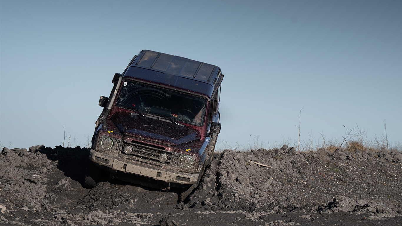 In den letzten Tagen hatten andauernde Regenfälle die Region geplagt, sodass der Grenadier nun tiefe Furchen in den Schlamm zog. Trotz BFGoodrich All-Terrains neigte das kraftvolle Drehmoment des BMW-Motors zum Durchdrehen der Räder, und auf dem rutschigen Untergrund fühlte sich die Lenkung besonders leicht an. Dennoch harmonieren Motor und Getriebe perfekt. Die Schaltvorgänge sind seidenweich und das Drehmoment wird kontinuierlich aus dem Keller abgegeben.