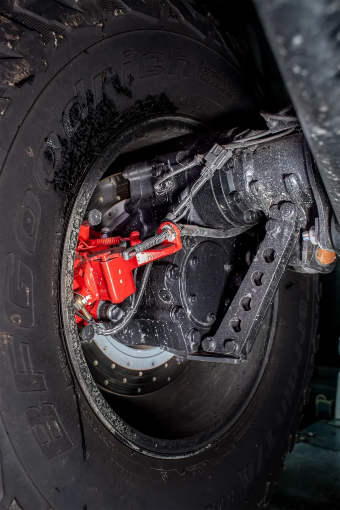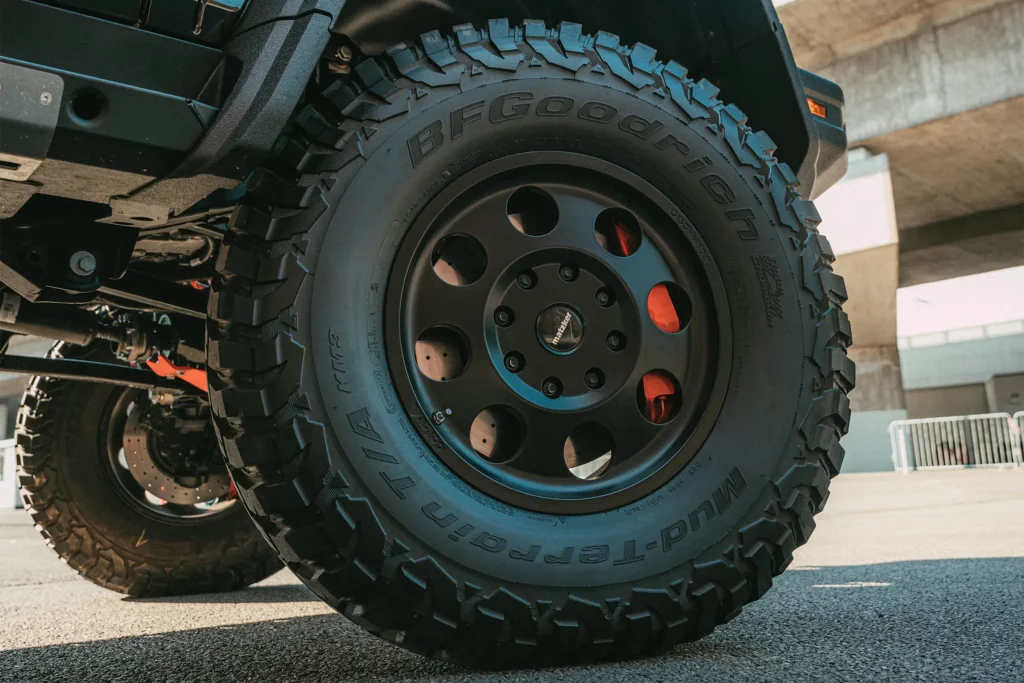 Die Portale erklären nur die halbe Höhe. Der Rest kommt von den BFGoodrich MudTerrain 37×12.50 R18, einem Maß, das Bernhard “typisch für radikale amerikanische Builds” nennt. Aggressiv und auf Traktion ausgelegt.